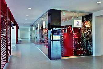 在Husqvarna摩托車總部,寶馬集團(tuán)決定委任Buratti+Battiston建筑設(shè)計(jì)團(tuán)隊(duì)來設(shè)計(jì)他們的新展廳。新建筑坐落在街道的一旁,用兩層高的全透明的玻璃墻打造。議會(huì)室、專賣店、摩托車的陳列室也可兼作老式摩托車的展覽廳。這個(gè)展廳主要是以紅色網(wǎng)格狀的金屬材質(zhì)打造,使展廳被一層一層的“面”包裹著,遠(yuǎn)觀會(huì)留給人留下非常深刻的印象。