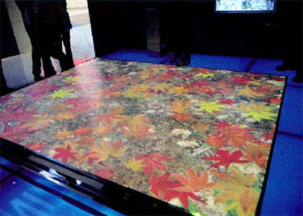 地面互動投影-展區(qū)里有塊IFLOOR互動投影系統(tǒng),它可以將任何的地板轉換成一個多點互動的表面。該系統(tǒng)通過智能圖像傳感器捕捉人體的運動,軟件自動識別判斷人體的位置與運動狀態(tài),并基于此產生不同層次的互動體驗。在這里,既可以漫步在潺潺流水中,微波蕩漾;又可以徜徉在楓樹林中,體味”秋風掃落葉” 的景致。